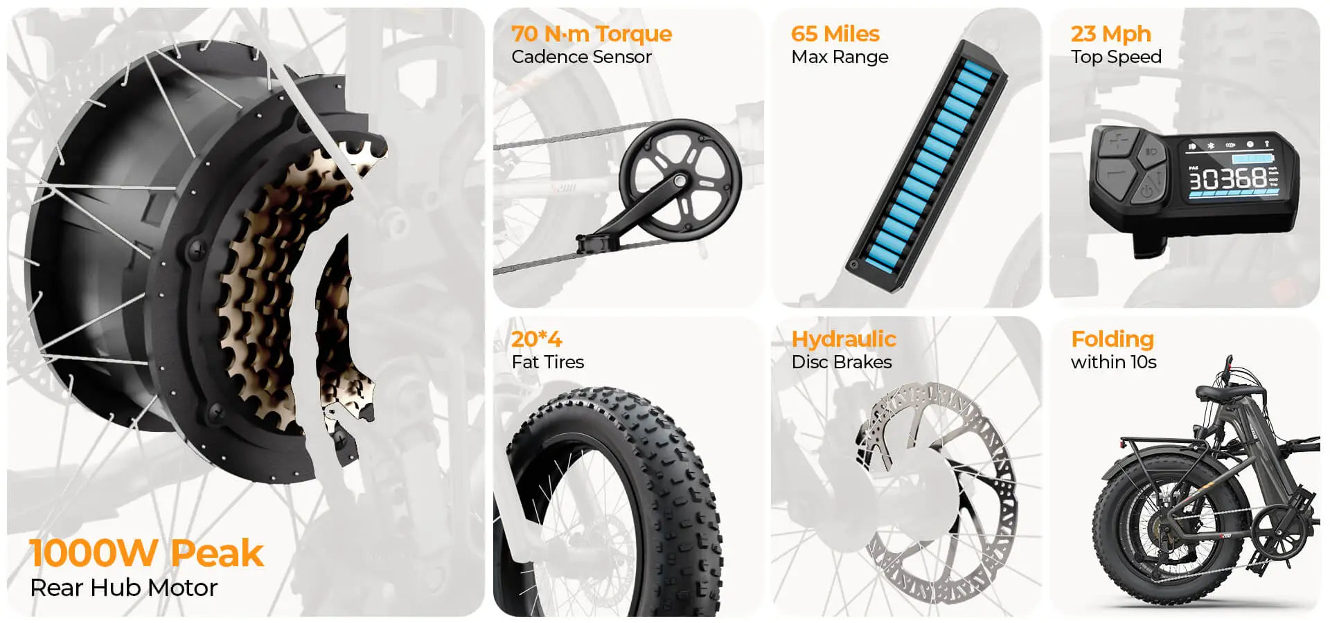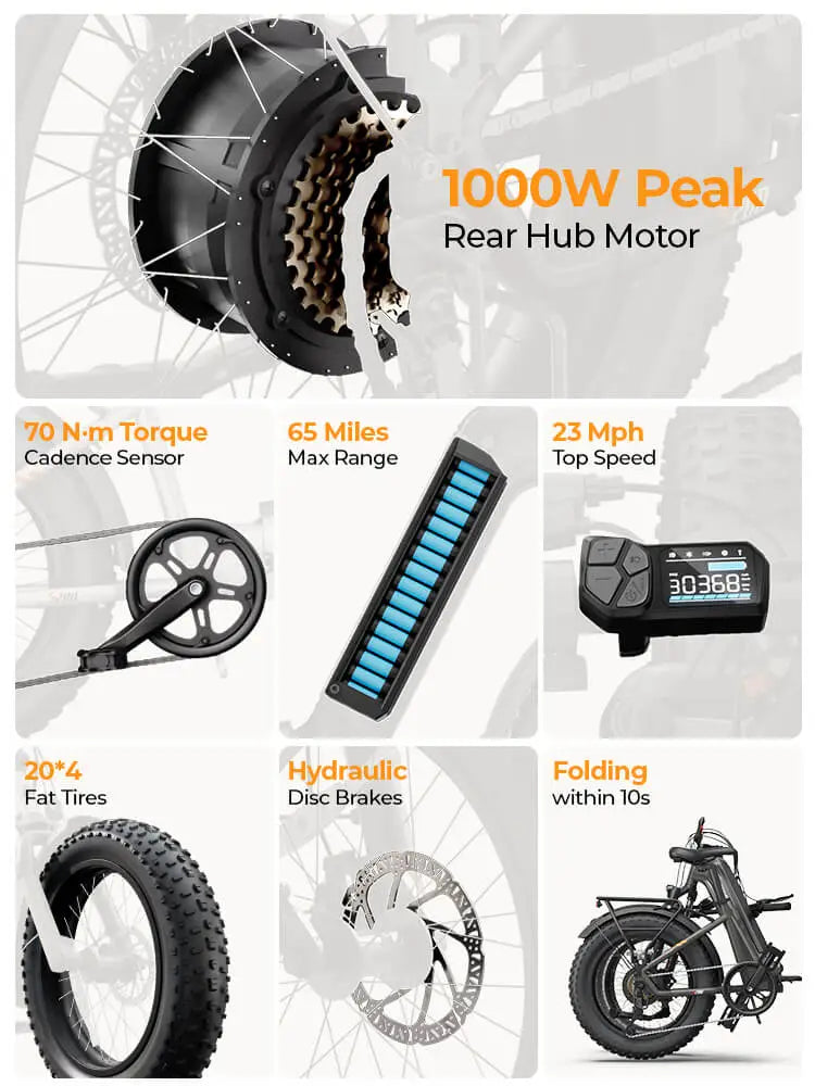 Experience a ride like no other. Featuring a hydraulic front fork, cadence sensor, and 20*4 fat tires, every journey feels buttery-smooth, delivering exceptional comfort, precise control, and unwavering confidence on any terrain.