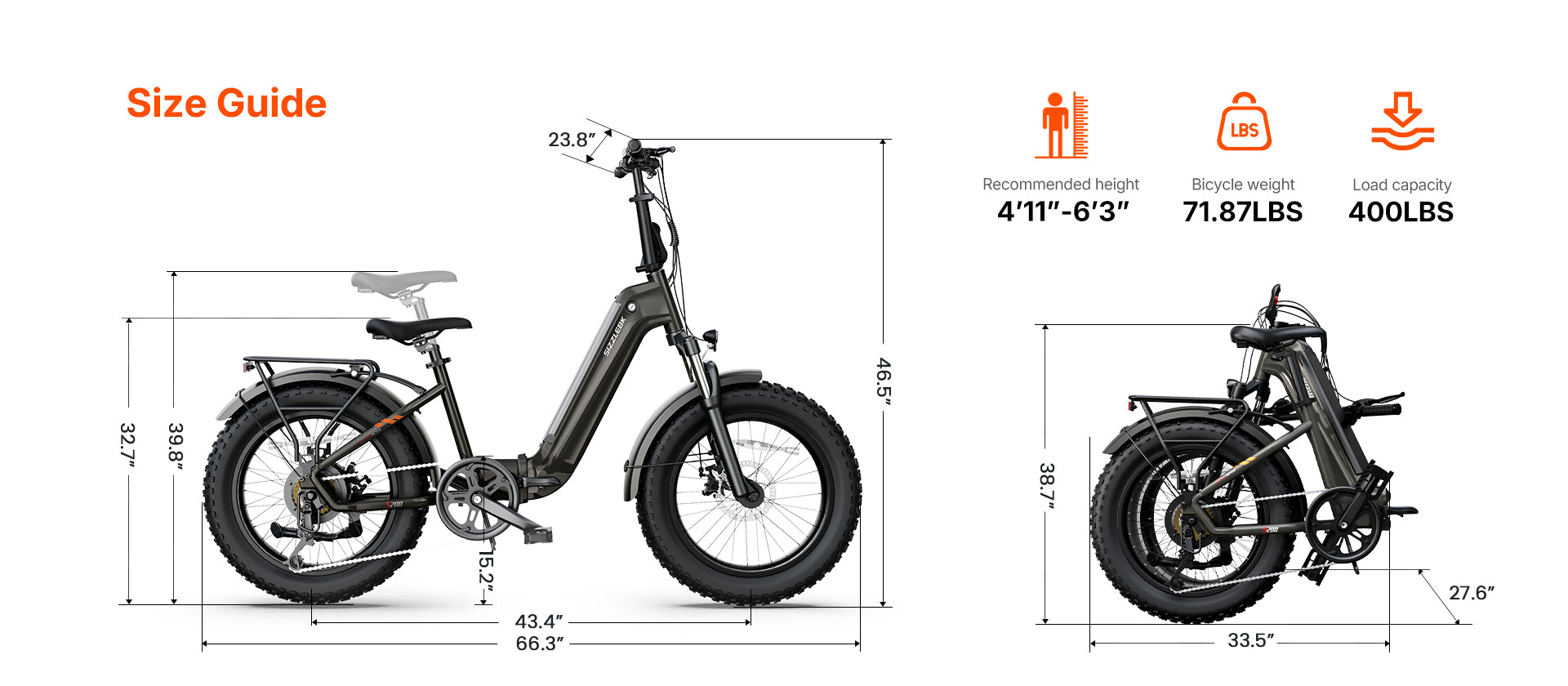 The recommended rider height for S200 is 4'11" ~ 6'3"; The total payload capacity of S200 is 400 lbs (not including the bike weight).