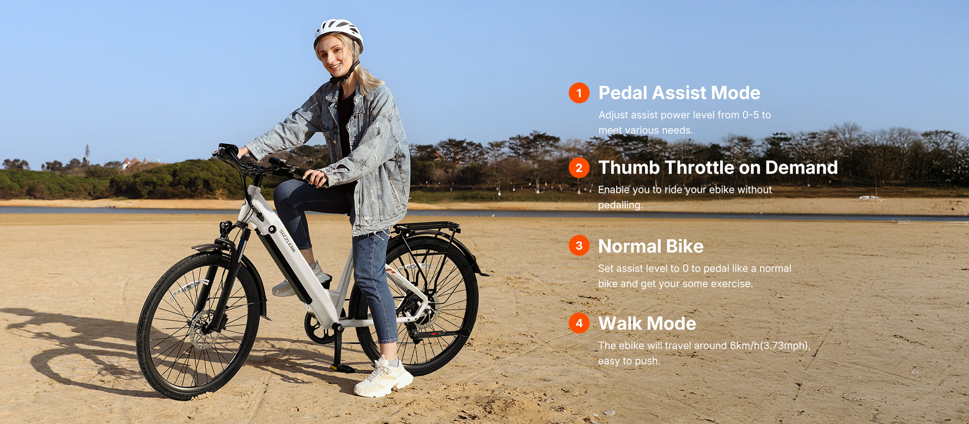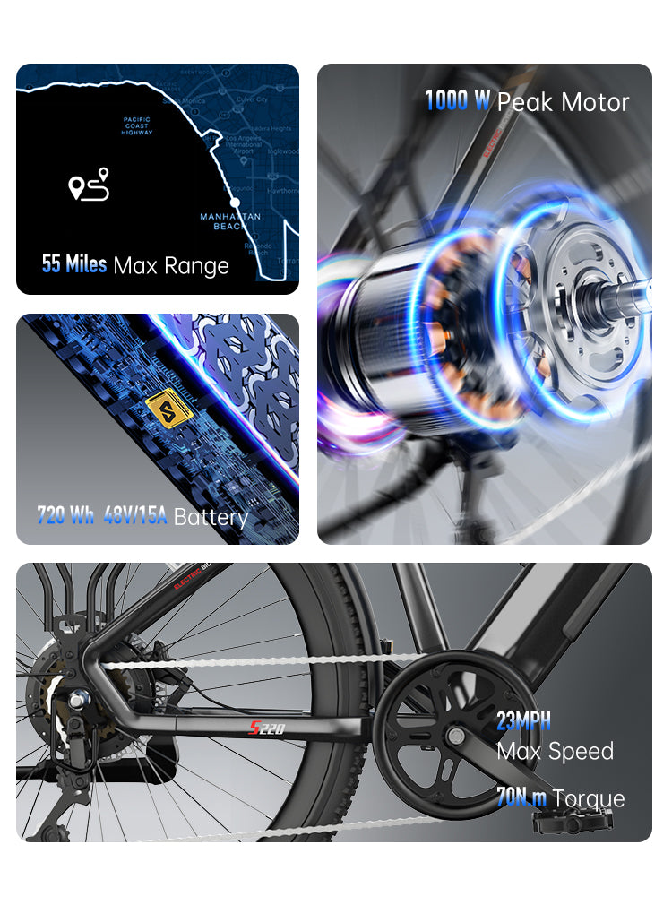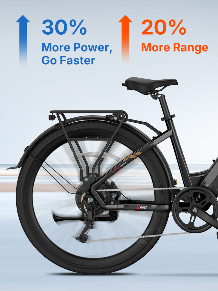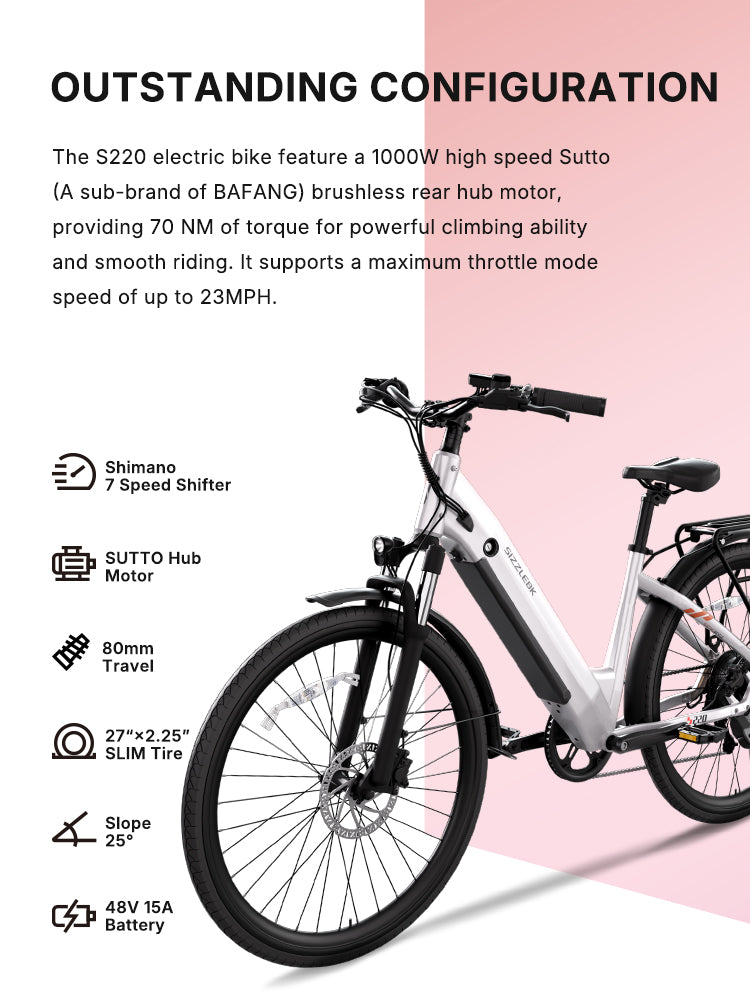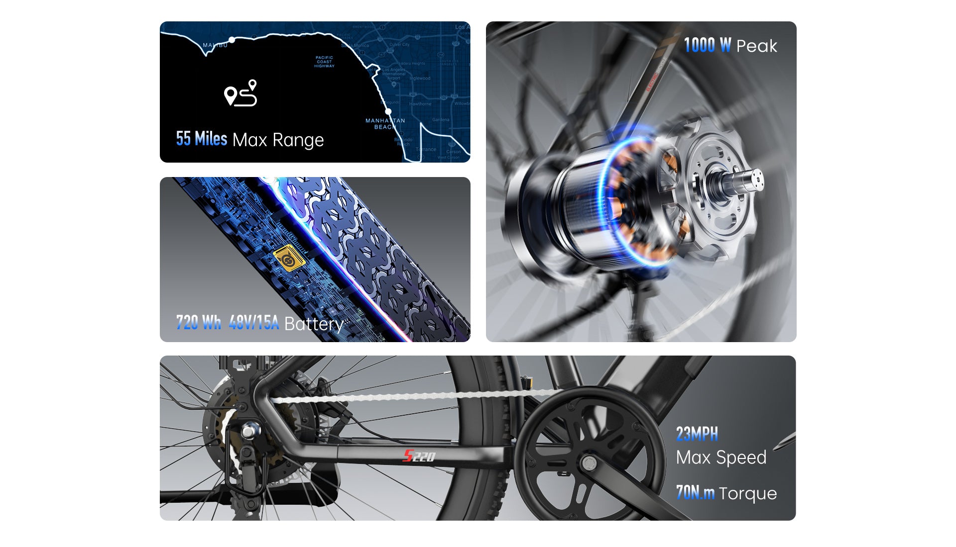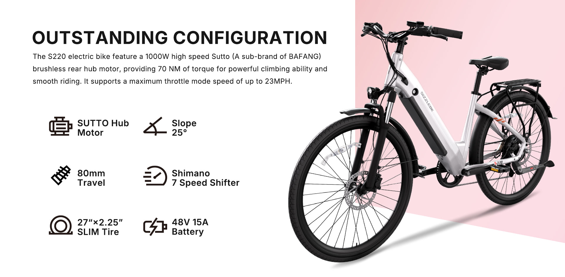 The S220 offers a theoretical range of up to 55 miles and a top speed of 23 MPH using pedal assist.